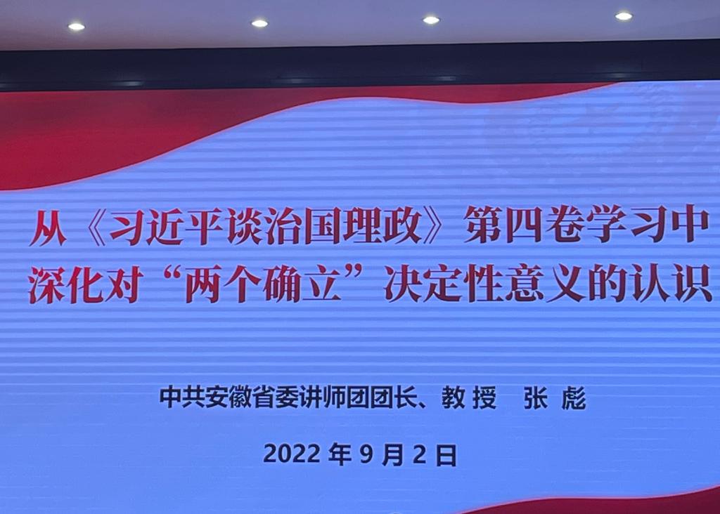 为贯彻落实习近平总书记在省部级主要领导干部专题研讨班上重要讲话精神,全省开展“举旗帜·送理论”省级示范宣讲活动。淮北市委宣传部邀请了中共安徽省委讲师团团长张彪教授于9月2日上午9时在市公安局报告厅作宣讲报告,张团长宣讲的主题为:从《习近平谈治国理政》第四卷学习中深化对“两个确立”决定性意义的认识。伟德国际1946源自英国刘奔前和孙澄澄老师作为入选的淮北市宣讲团成员,代表学校参加会议。